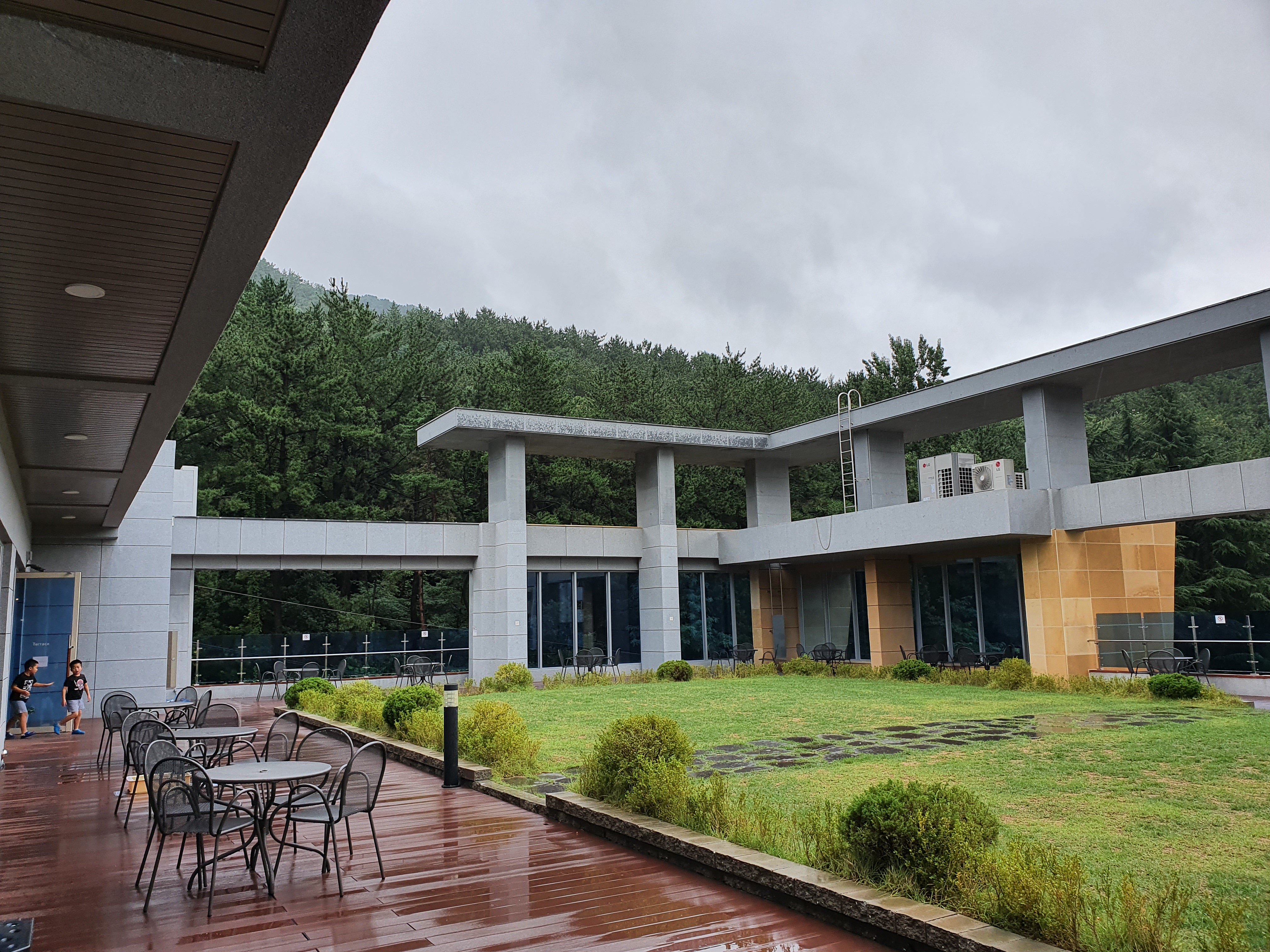 야외 테라스가 있어서 맑은날에는 여기서 앉아서 커피를 마시는 사람도 많다.오늘은 비가와서 어른들은 안나오고 같이 따라온 어린애들만 놀고있다.