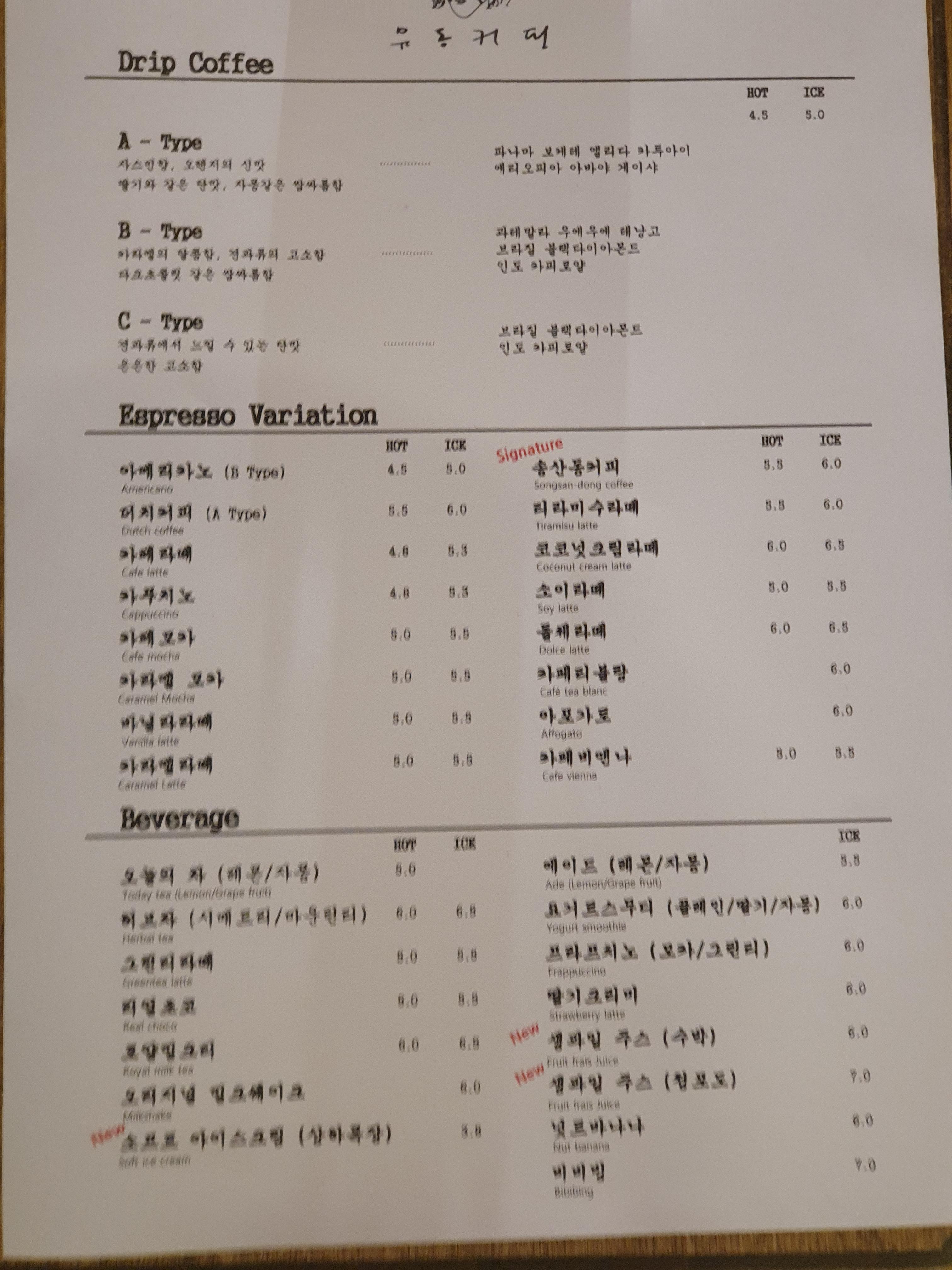 메뉴다. 에스프레소말고도 드립커피가 있는데 드립 내릴때 시간이 걸리기 때문에 조금 기다려야 한다. 드립커피는 여러 원두를 블렌드한 것인데 타입이 세가지가 있다.