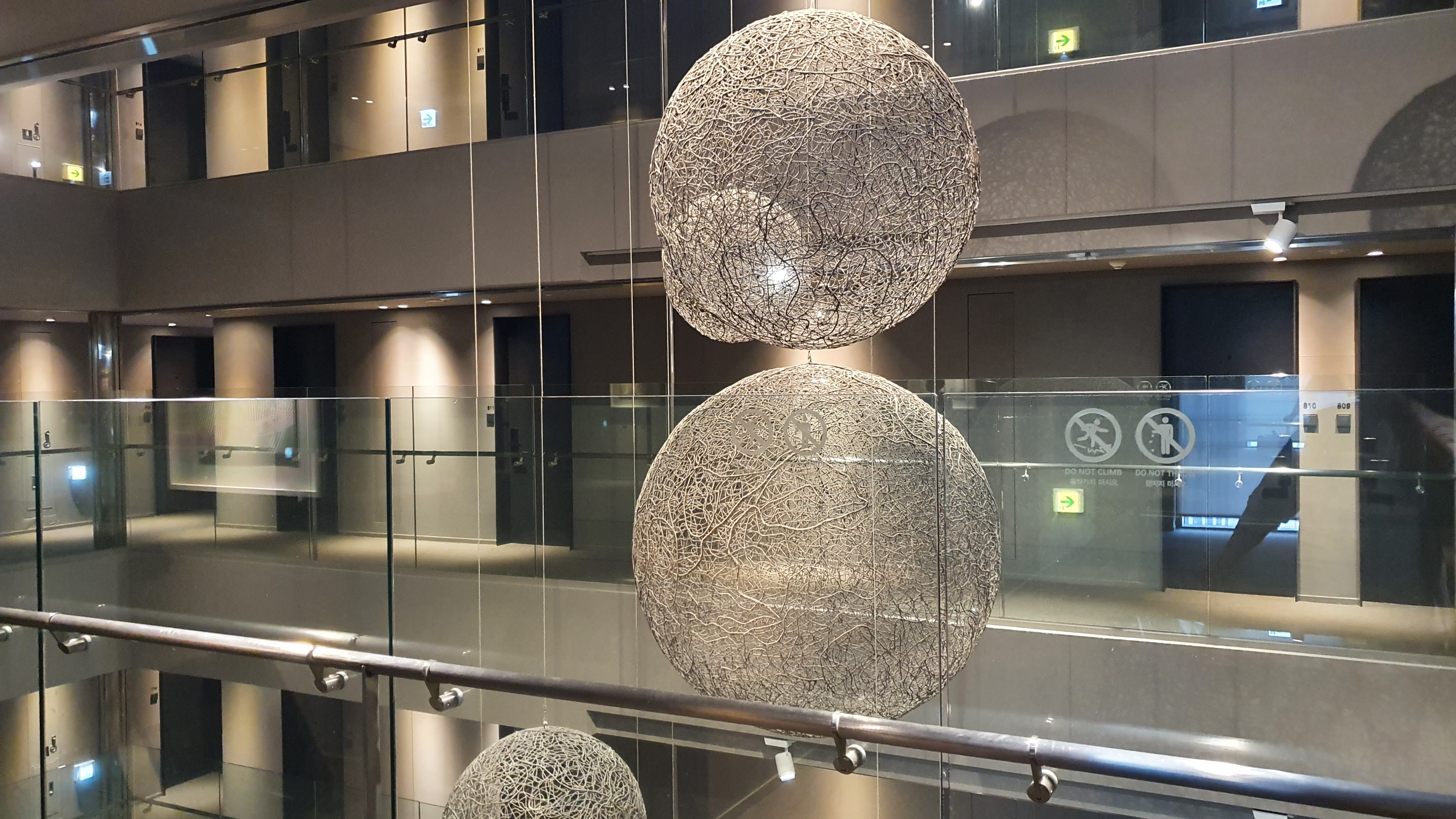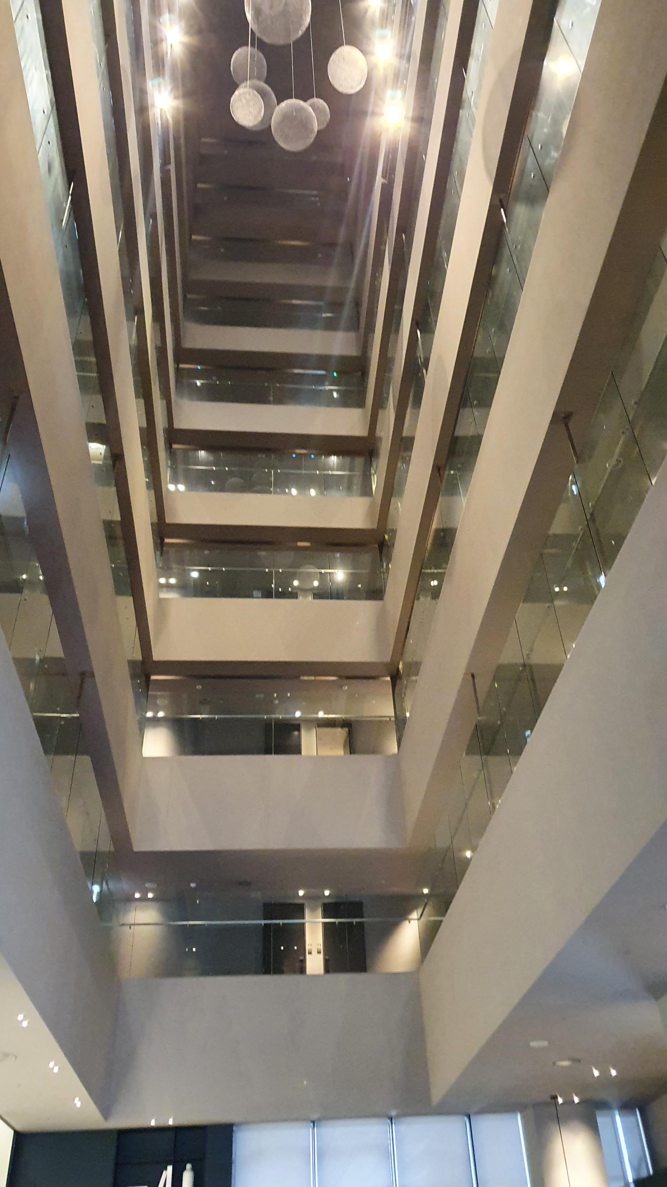 로비에서 위를 보면 꼭대기층까지 트여있는 모습. 가운데 조형물이 정말이쁘다.