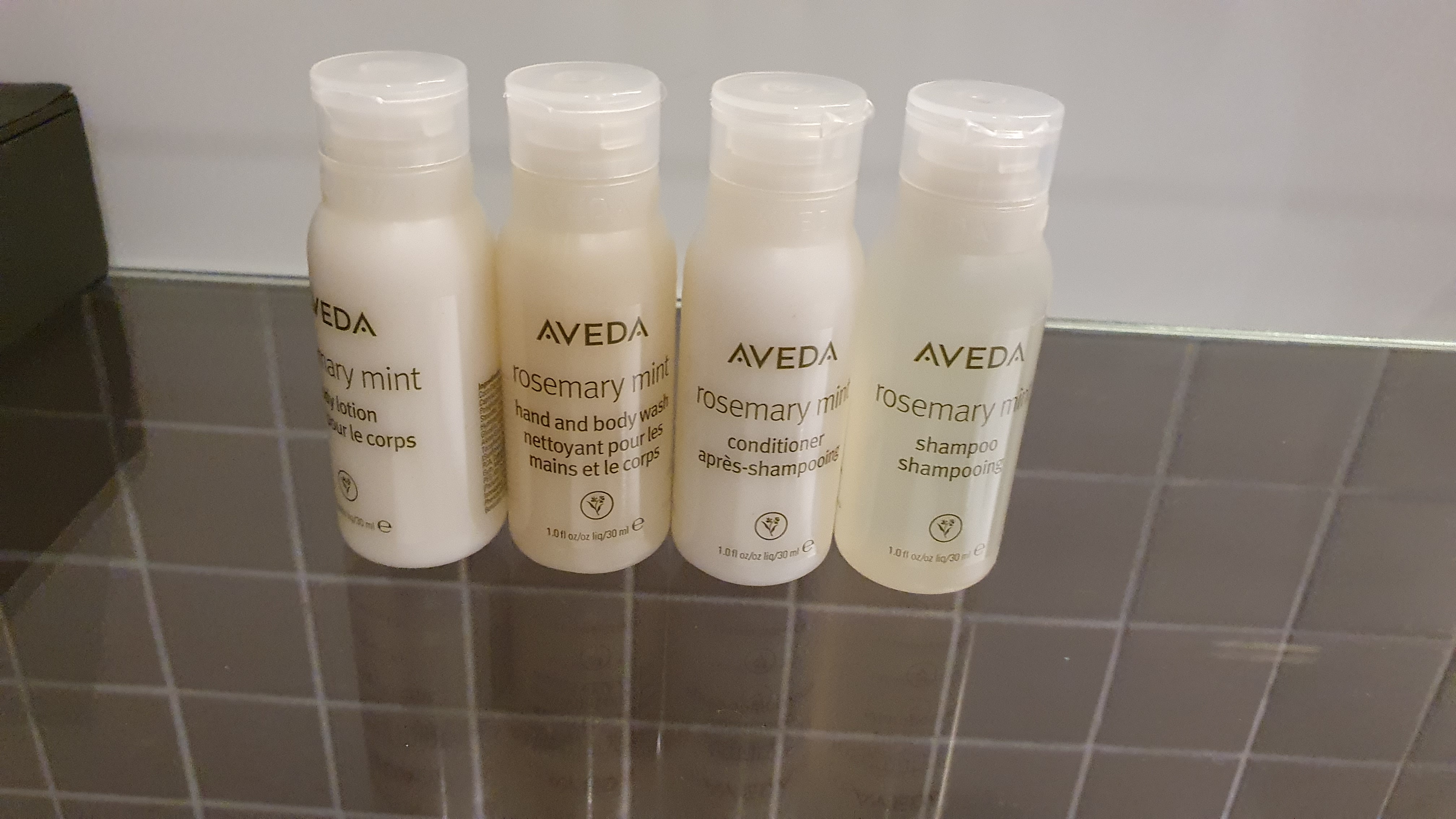 샴푸,바디워시,바디로션,린스가 구비되어 있고, 왼쪽 상자 안에는 면도기와 칫솔세트가 따로 있다.