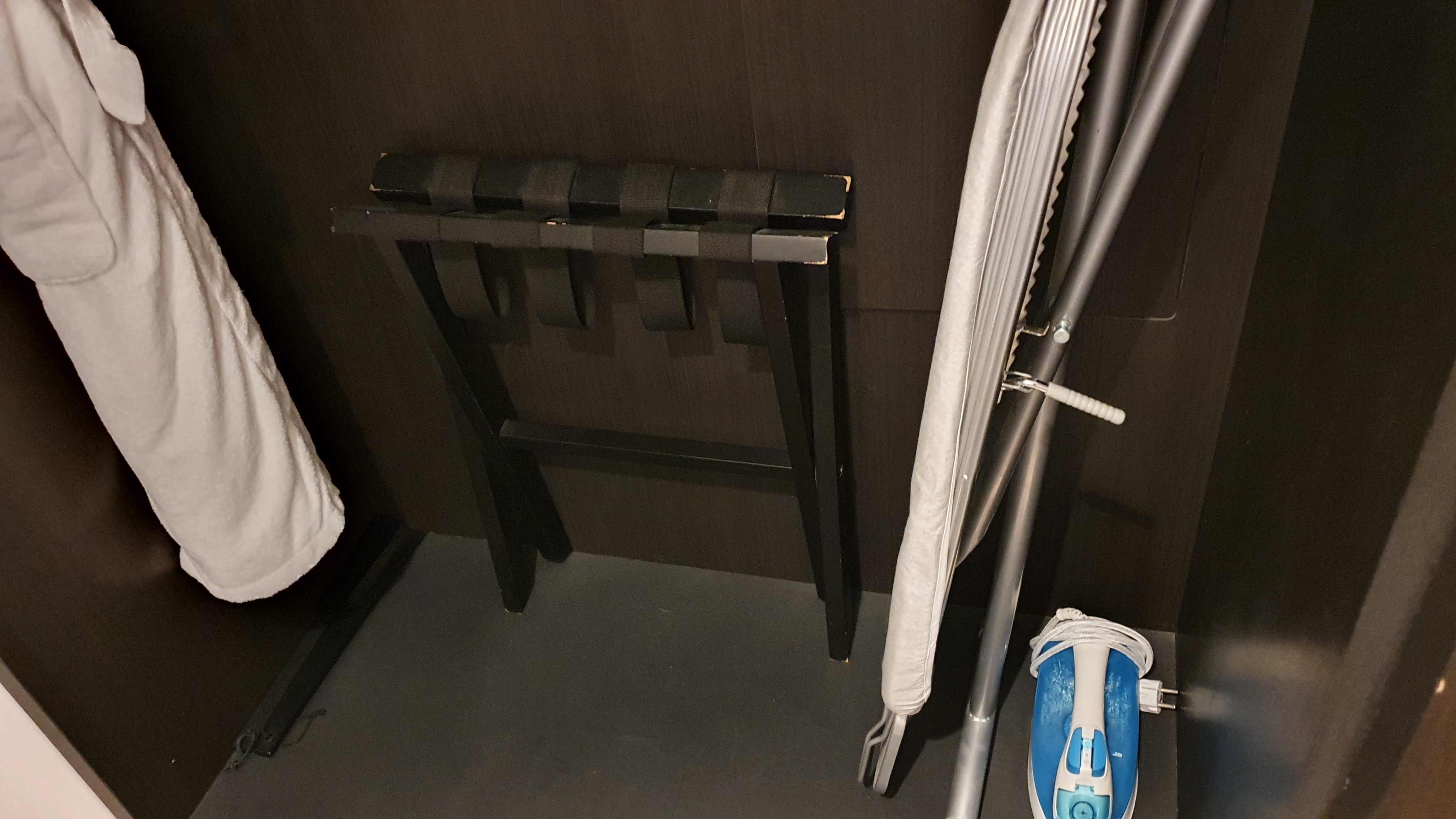 옷장 안에는 여분의 샤워가운과 다리미, 캐리어를 올려놓는 것?이 있다.