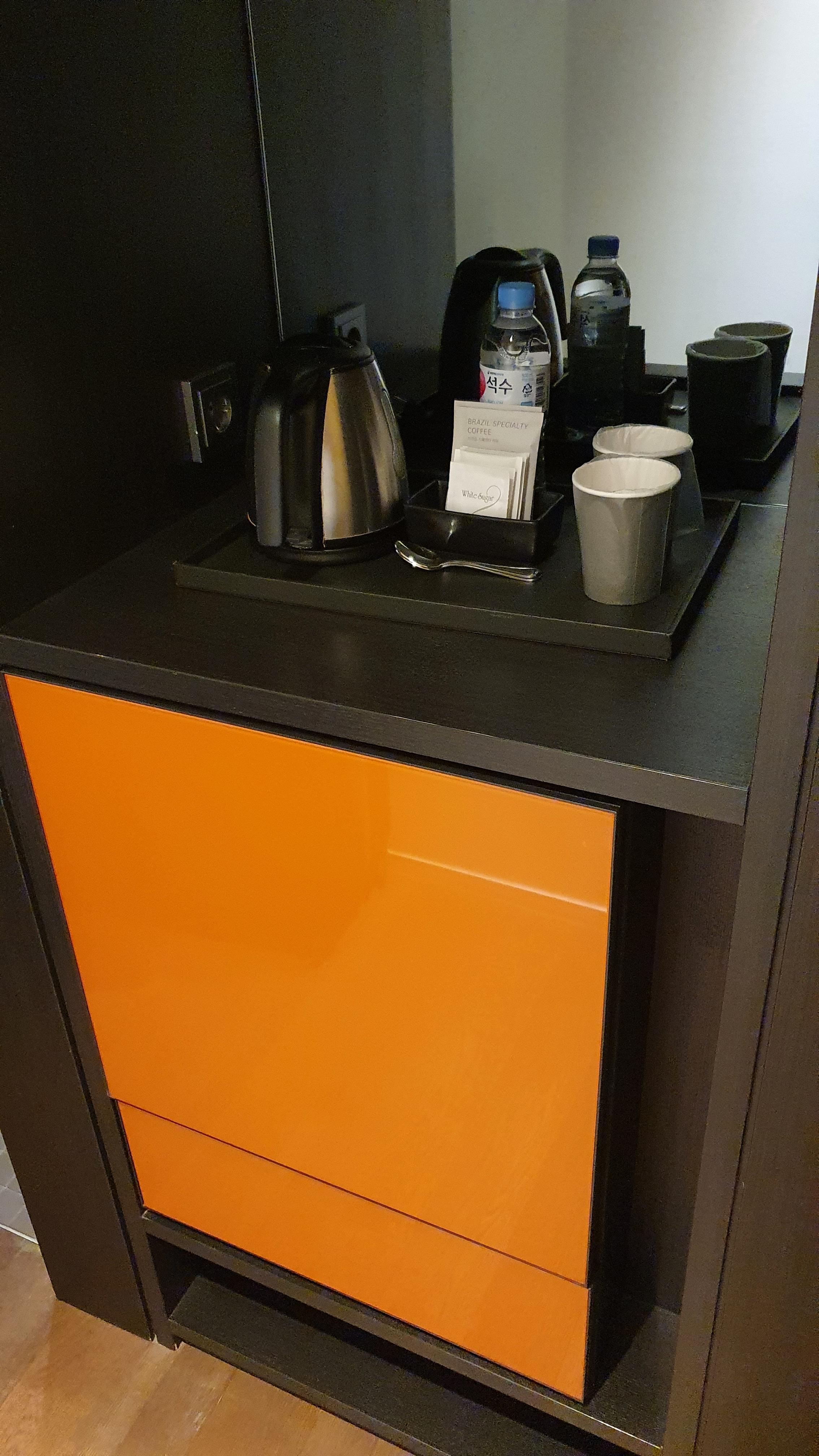 아래 주황색 수납공간을 열면 냉장고가 있고, 상온에 생수 1병, 냉장고에 1병이 있다.