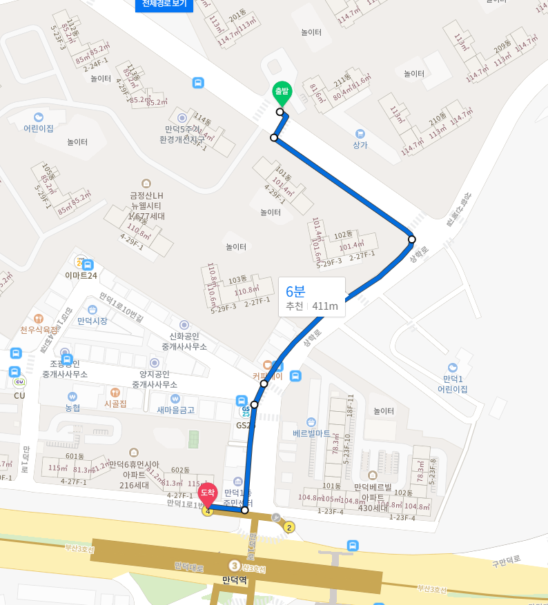 역세권여부 : 주출입구~만덕역까지 400미터가량, 도보 6분 역세권