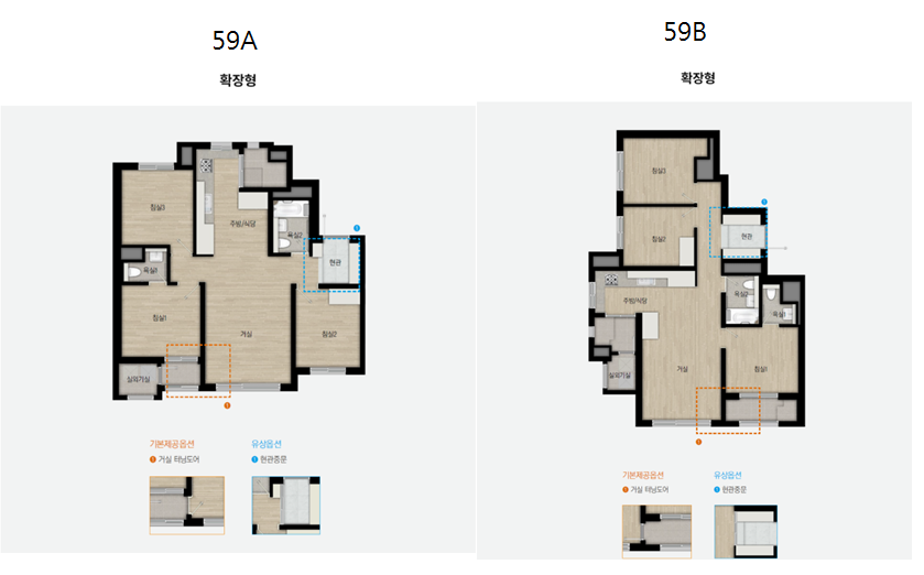 실거주 목적으로 59평형을 노린다면 59A를 추천한다. 기본적으로 59A타입은 판상형, 59B타입은 타워형이다. 물량 또한 A타입이 많다. 환기문제는 거주해 보면 큰 만족도를 차지하는 부분이기 때문에, 조금 경쟁이 치열할테지만 실거주를 하는 사람일수록 더더욱 판상형을 가야한다.