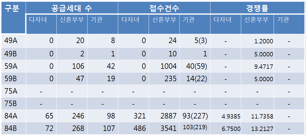목요일에 모집 한 특별공급 결과이다. 75타입은 매물이 적은만큼 특별공급 대상에서 제외 되었고, 다자녀 또한 가족 구성원 수가 많은 실정을 고려해서 84타입에만 모집을 했다. 기관 수량에서 괄호 안은 예비신청자 수이다. 기관의 경우 일반 특공과 추첨구조가 조금 달라서 경쟁률 산입을 하지 않았다.