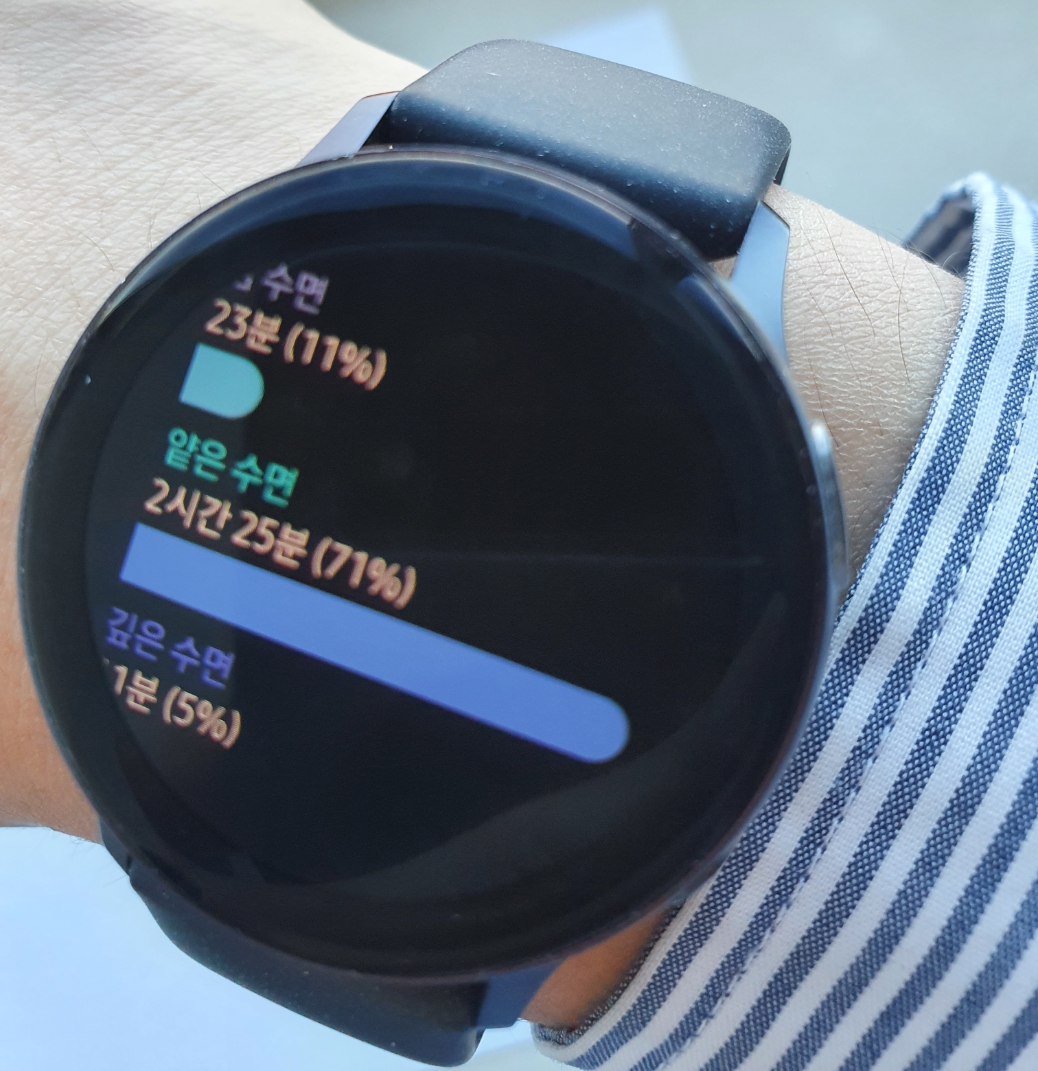 워치를 찬 채로 잠자리에 들면 맥박과 수면중 움직임 분석을 통해 깨어있는 시간, REM수면, 얕은수면, 깊은수면시간을 기록한다. 기록한 데이터는 연결된 휴대전화의 삼성헬스 어플과 연동되어 수면패턴을 확인해서 양질의 수면관리에 도움을 준다. 사실 수면로그를 보면서 제대로 잠을 자지 못해가지고 다음날은 더 오래자야지 하며 반성하는 점이 더 큰 것 같다.