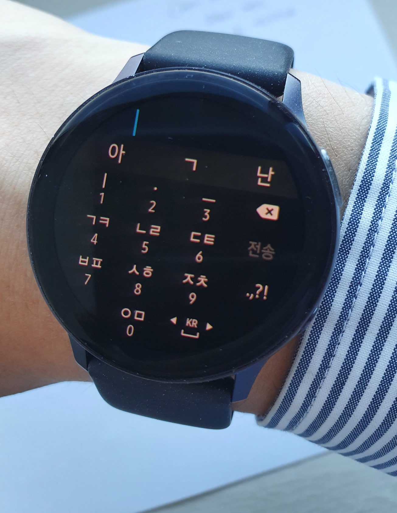 타이핑 - 화면이작아서 메세지 회신을 하려면 타이핑이 조금 어렵다. 나는 그냥 카톡이나 문자메세지, 메일이 온것을 확인만하고 끄는정도이고, 매크로기능이 있어서 간단하게 회신할 때 예 / 아니오 / 맞아요 / ㅋㅋㅋ / ㄱㄱ 정도를 등록해서 사용중이다.